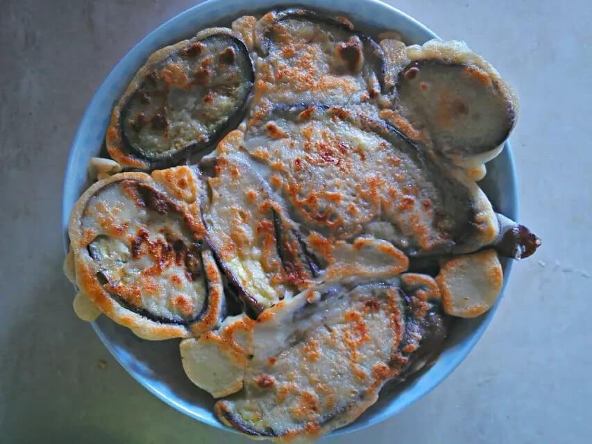 将两面煎至半熟的茄子饼置入微波炉或烤箱内烤熟,可能又是不同做法的一次尝试
