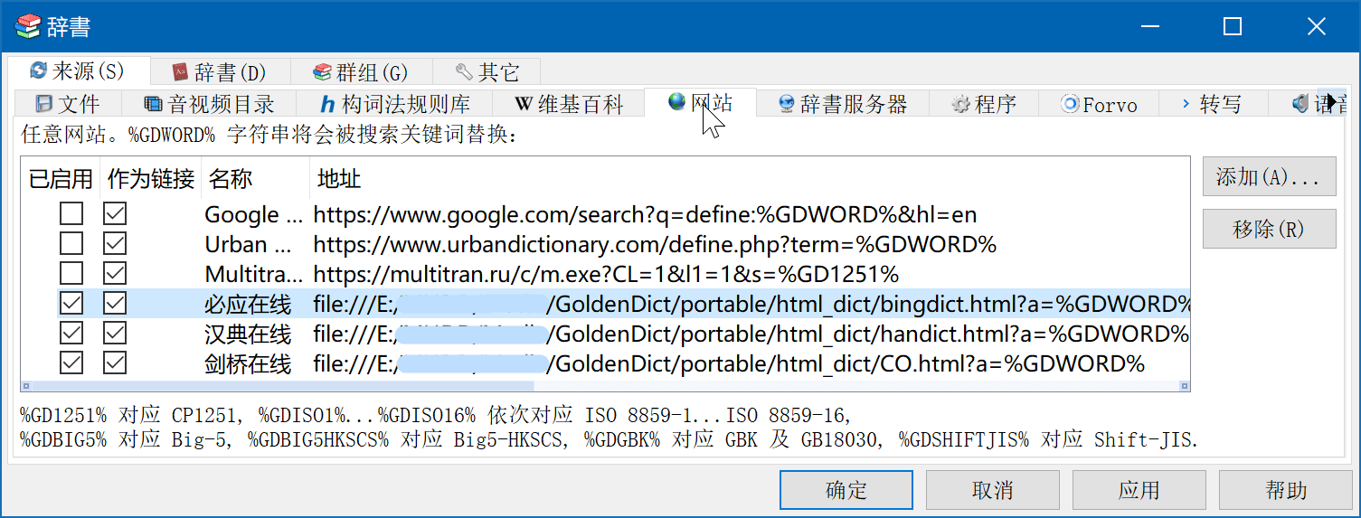 点击GoldenDict++菜单栏编辑>辞书打开来源>网站页面,点击添加按钮 ,然后编辑新添加的条目 — 勾选已启用,可选作为链接(如查询结果为动态加载面或网页加载速度较慢,请勾选作为链接项),名称 自定,按格式填写地址,即可添加网站类型的辞书: