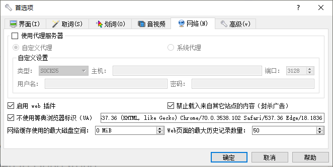 编辑完成点击确定按钮即可。为获得理想的查询效果,还可以在GoldenDict++菜单栏点击编辑>首选项打开网络页面,勾选不使用默认的浏览器标识,并设置UA标识为Edge或Chrome等浏览器的,如: