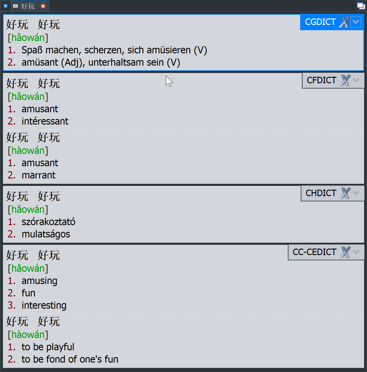 上述几部词典均为简明词典,在GoldenDict++中有着相同的表现样式: